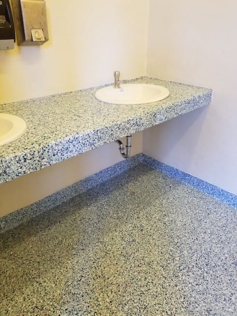 Public restroom floor coated with Primetech 21, full broadcast of vinyl chips and Protech 7072SC topcoat