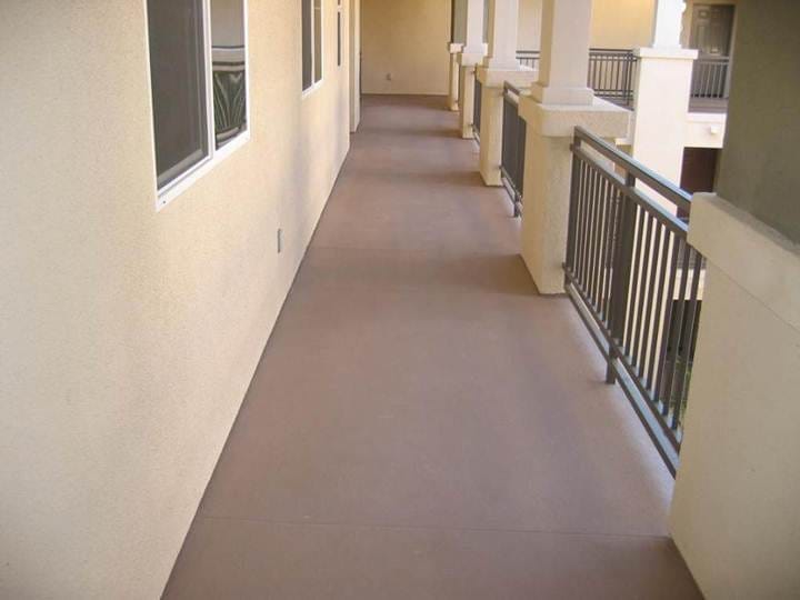 Exterior apartment walkway coated with a waterproofing industrial coating