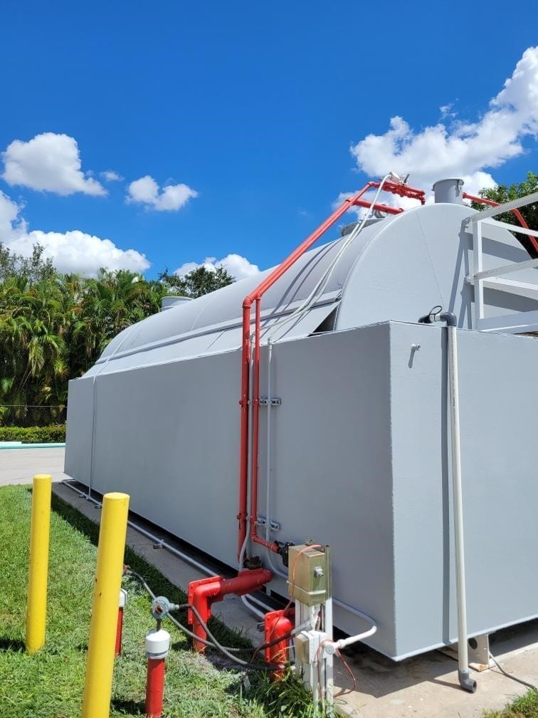 Outdoor fuel storage tank coated with Evotech 1000 spray-on bedliner and topcoated with Protech 7072SC